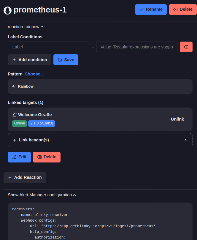 On définit un nom (ici prometheus-1 , super inspiré), puis une réaction, qui va définir un pattern d'affichage, un intervalle mini entre 2 alertes. On va lier notre blinky à cette alerte (dans le cas où l'on en a plusieurs), puis il suffira de copier la configuration d'alertmanager sur notre application en production.