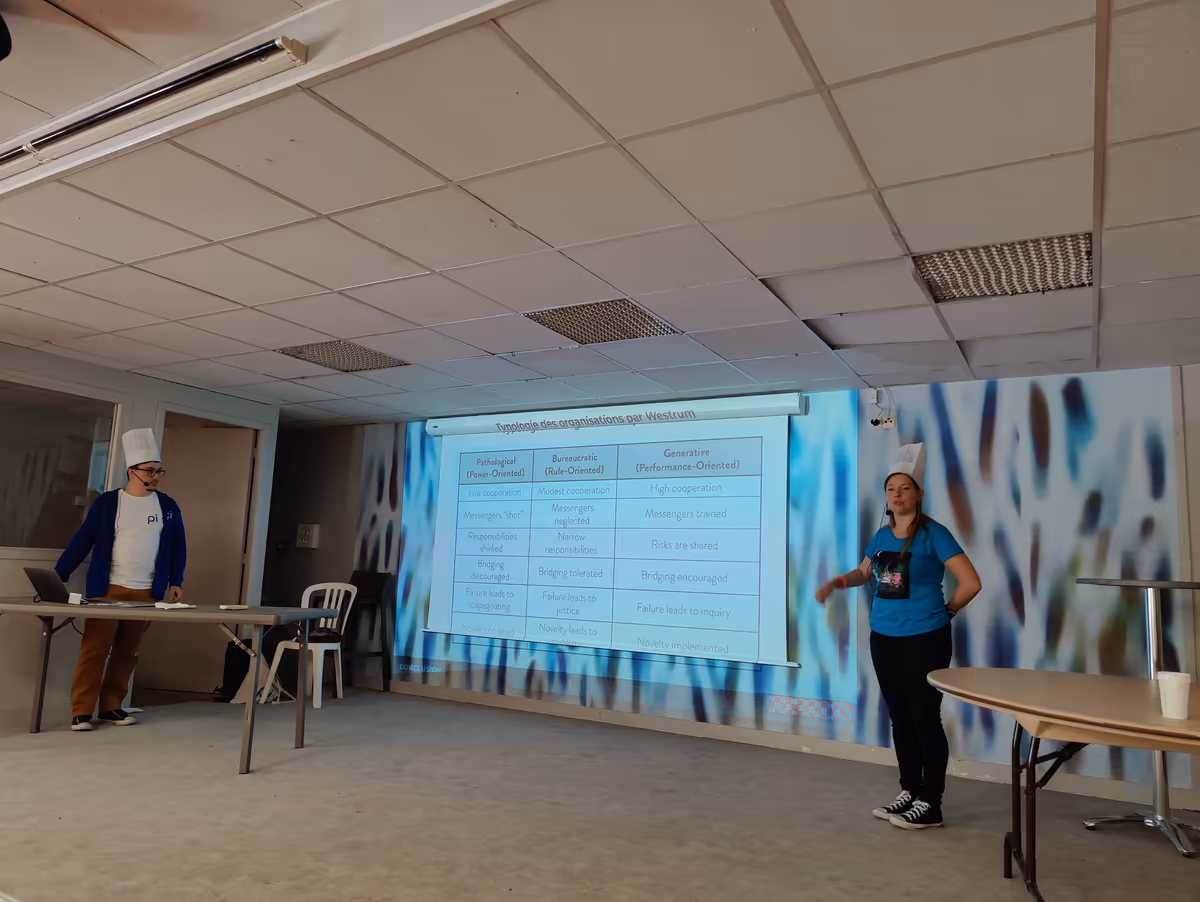 L'équipe de PIX avec Estelle Landry et Yvonnick Frin au fourneaux, nous font un REX sur leur organisation de dev pour aller de l'idée en production, en mode recette de cuisine (et toque sur la tête ;)).