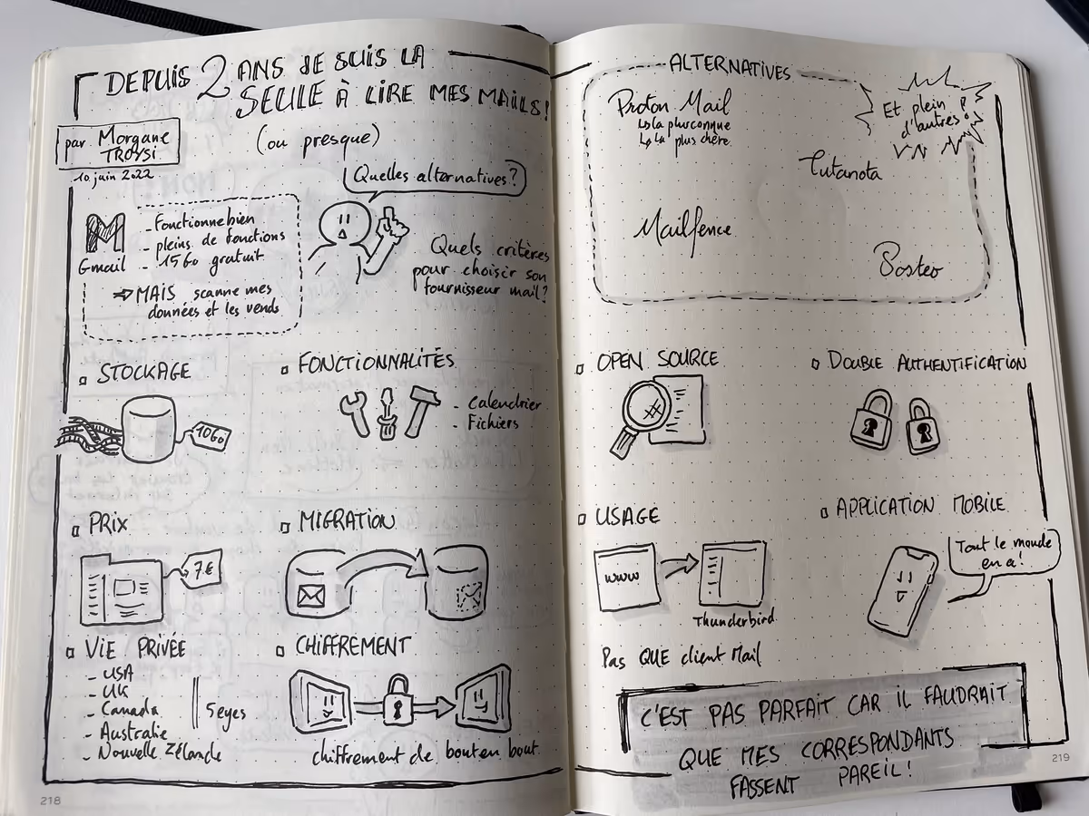 Durant le Talk autour de l'utilisation de solutions mél respectueuses de la vie privée, Morgane Troysi nous présente le fruit de ses recherches d'une solution alternative à GMail. Au travers d'une matrice comparative, Morgane a comparé Proton Mail, Posteo, Mailfence ou encore Tutanota sur des critères comme chiffrement, taille de boite, protocoles, publicité et bien sûr, le prix.
