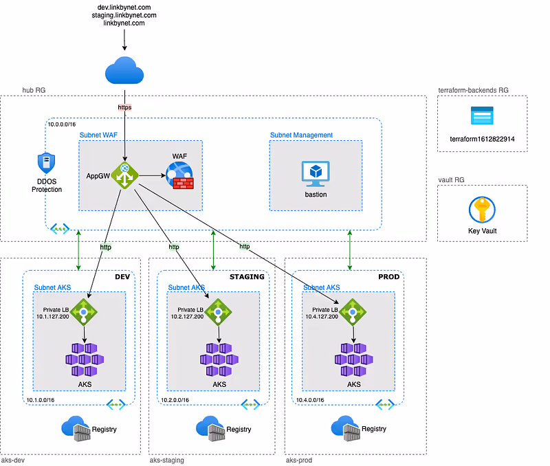 In this article, I will present an example of an enterprise grade Azure infrastructure, based on the hub and spoke model, with multiple AKS environments.